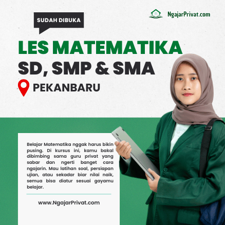 Selamat datang di NgajarPrivat.com, layanan les matematika privat yang siap membantu anak-anak Ayah dan Bunda yang tinggal di Pekanbaru. Kami menyediakan kursus matematika yang dapat dilakukan secara privat dengan dua pilihan metode belajar: offline, di mana guru kami akan datang langsung ke rumah siswa, dan online melalui Zoom atau Google Meet secara interaktif, bukan hanya sekadar menonton rekaman. Metode pembelajaran kami dirancang agar anak-anak SD, SMP, dan SMA dapat belajar matematika dengan cara yang menyenangkan, efektif, dan sesuai dengan kebutuhan mereka.