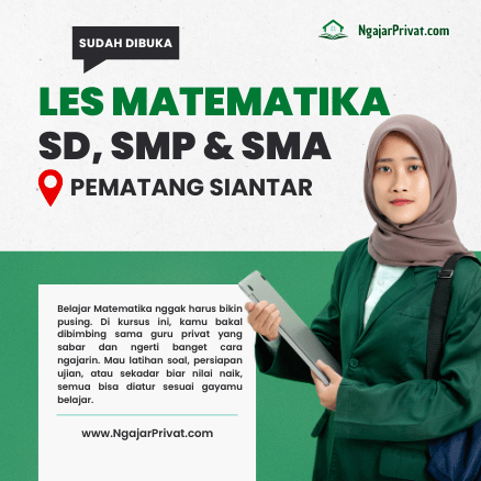 Kami dari NgajarPrivat.com dengan bangga mempersembahkan layanan les matematika privat terbaik khusus untuk Ayah dan Bunda yang tinggal di Pematang Siantar. Kami melayani bimbingan belajar matematika secara privat, baik secara offline dimana guru datang langsung ke rumah siswa, maupun secara online lewat Zoom atau Google Meet yang interaktif, bukan hanya sekadar menonton rekaman. Layanan kami ditujukan untuk membantu anak-anak SD, SMP, dan SMA agar lebih mudah memahami matematika dan meraih prestasi yang lebih baik.
