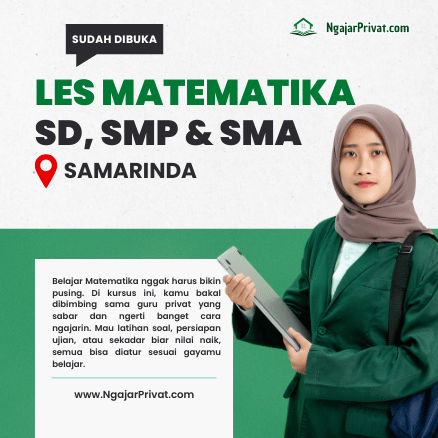 Selamat datang di NgajarPrivat.com, layanan les matematika privat yang siap membantu anak Ayah dan Bunda di Samarinda meraih prestasi terbaik. Kami melayani bimbingan belajar offline (guru datang ke rumah siswa) untuk kamu yang tinggal di Samarinda, dan juga online lewat Zoom atau Google Meet. Bedanya, kelas online kami bukan sekadar menonton video rekaman, tapi interaktif — anak bisa bertanya langsung dan berdiskusi dengan guru.